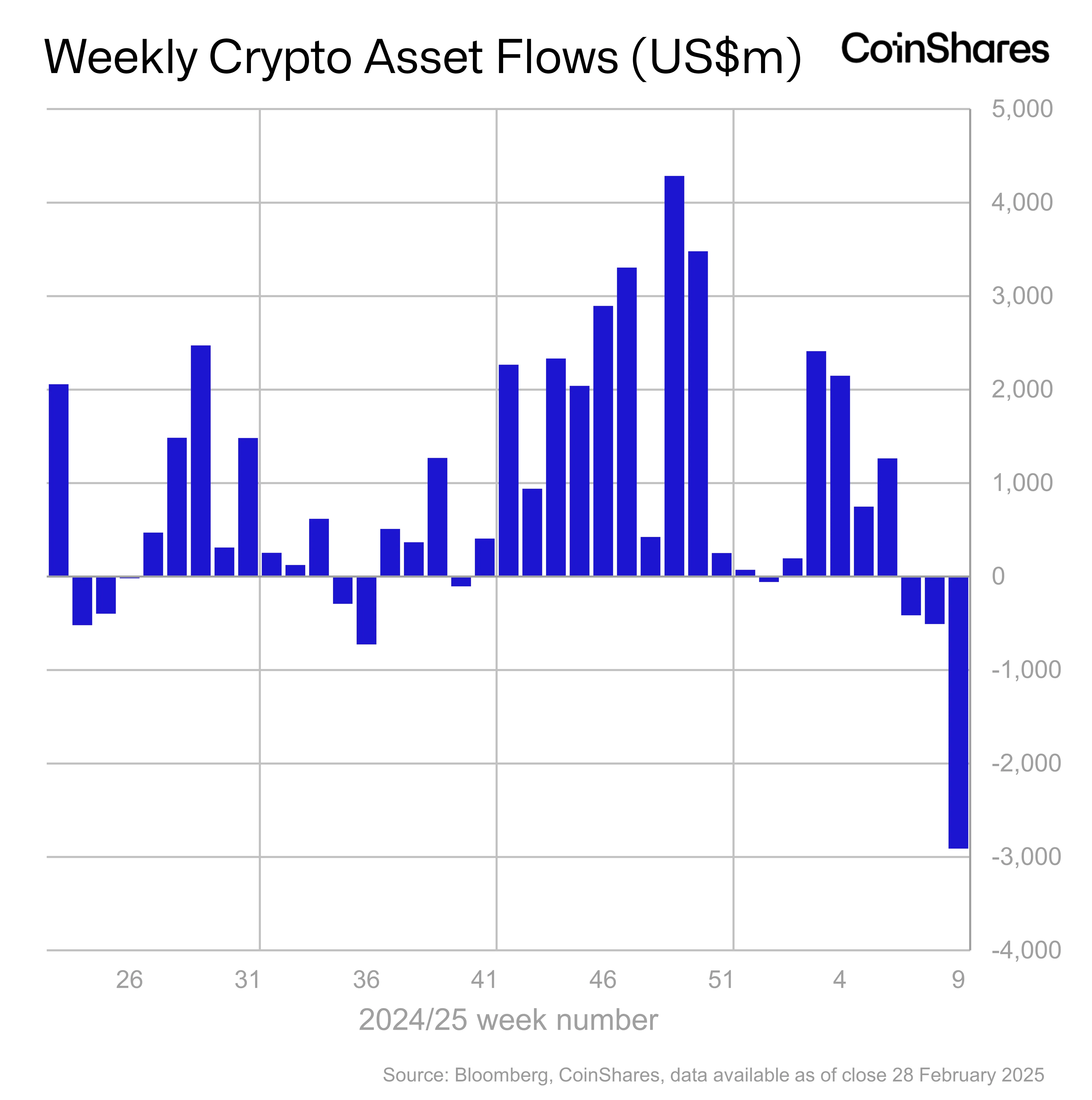 Bitcoin took the biggest hit, with outflows of $2.6 billion. Ethereum also suffered, recording a record weekly outflow of $300 million. Other altcoins like Solana and Ton also saw significant outflows.